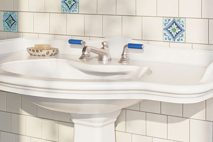 California Faucets’ Del Mar series with Blue Porcelain Lever handles add a pop of personality to the bath