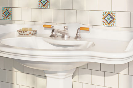 Del Mar’s Orange Porcelain handles bring a fresh twist to the bath
