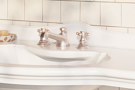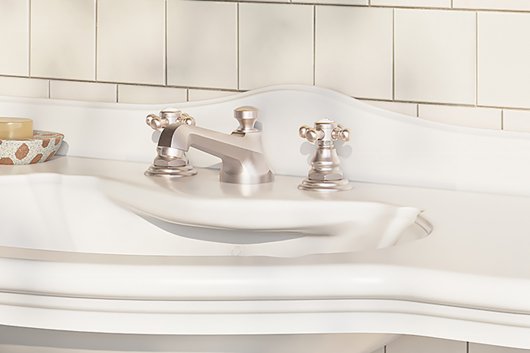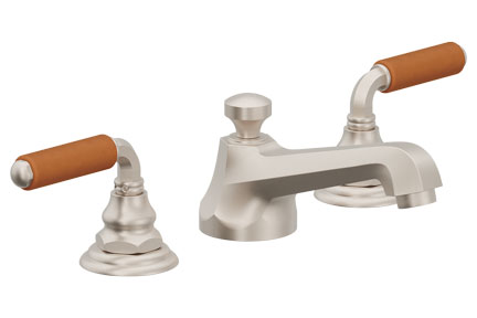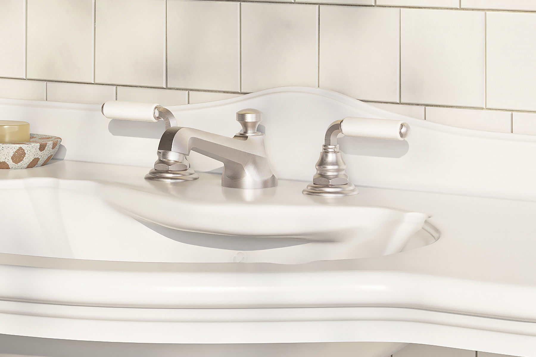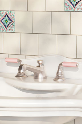 The collection is available in widespread or single-hole deck mounted versions as well as single- or double-handle wall mounted options. In addition to the array of colorful porcelain handle choices, Del Mar is also available in Art Deco Black and Red, along with the original Metal Lever handle and classic Cross Handle designs.